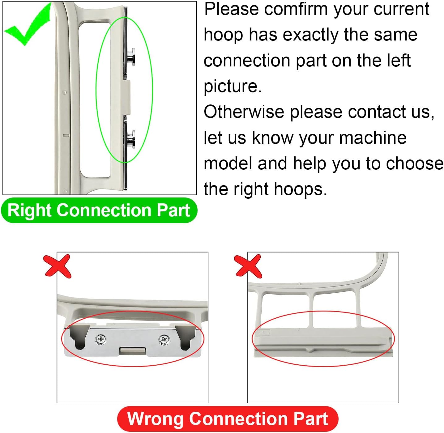 Note: The connection parts on these hoops are pegs, these hoops only works with the compatible embroidery machines’ slot connection part.